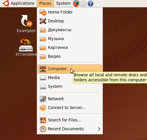 Pour les diagnostics, vous devez utiliser l'utilitaire Ubuntu. Avant de commencer le test, vous devez écrire l'image de distribution sur le disque. Téléchargez ensuite le programme à partir du disque sans l'installer sur l'ordinateur portable. Ensuite, dans la fenêtre qui s'ouvre, vous devez entrer Lieux et sélectionner Ordinateur.