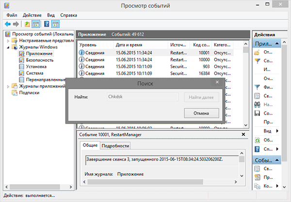 - Si la boîte de dialogue n'apparaît pas, le résultat du test peut être affiché dans les journaux: Windows Logs / Application / Search, entrez Chkdsk.