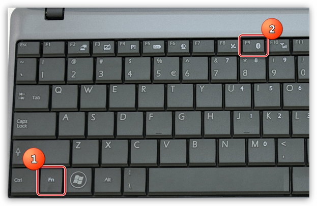 Si l'ordinateur a Bluetooth intégré, le clavier doit avoir un bouton correspondant pour l'allumer. En règle générale, une icône sous la forme de la lettre «c» est dessinée dessus. Cette touche active la fonction, et après l'avoir appuyée, elle doit s'allumer s'il y a de la lumière dedans. En témoigne une petite icône en bas à droite près du Wi-Fi.