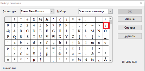 Lorsque l'entrée numérique est activée, la désignation souhaitée est facile à définir à l'aide du code Alt approprié. Dans ce cas, tout en maintenant la touche Alt enfoncée, vous devez composer le code 63. Les combinaisons de codes Alt sont indiquées dans le tableau: