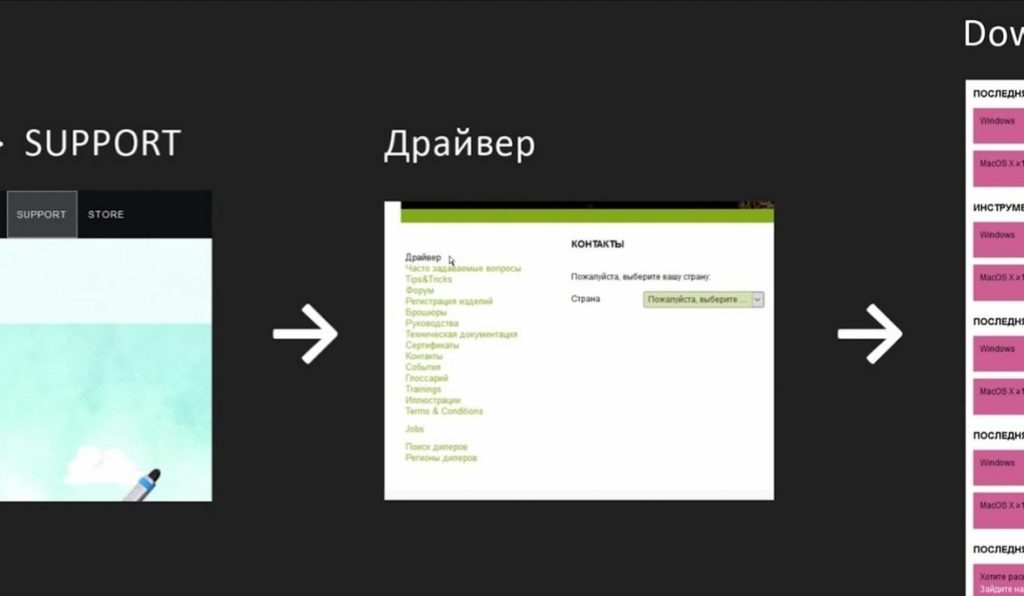 Une version mise à jour des pilotes peut être trouvée sur le site Web du fabricant sur Internet et téléchargée. Le fabricant a un site Web www.wacom.com où vous devez trouver le bouton d'assistance. Juste en dessous de la barre de recherche, sur la page avec la barre de navigation, il y a un certain nombre de fenêtres, dont la première s'appelle les pilotes. Nous allons dans la fenêtre des pilotes, où vous pouvez trouver non seulement les mises à jour du nouveau 2018, mais aussi les pilotes des modèles précédents. Ensuite, vous devez sélectionner votre système d'exploitation et le modèle de l'appareil, qui est téléchargé en cliquant sur le bouton de téléchargement.Par conséquent, les pilotes mis à jour seront téléchargés sur l'appareil, qui seront ensuite installés conformément aux instructions.