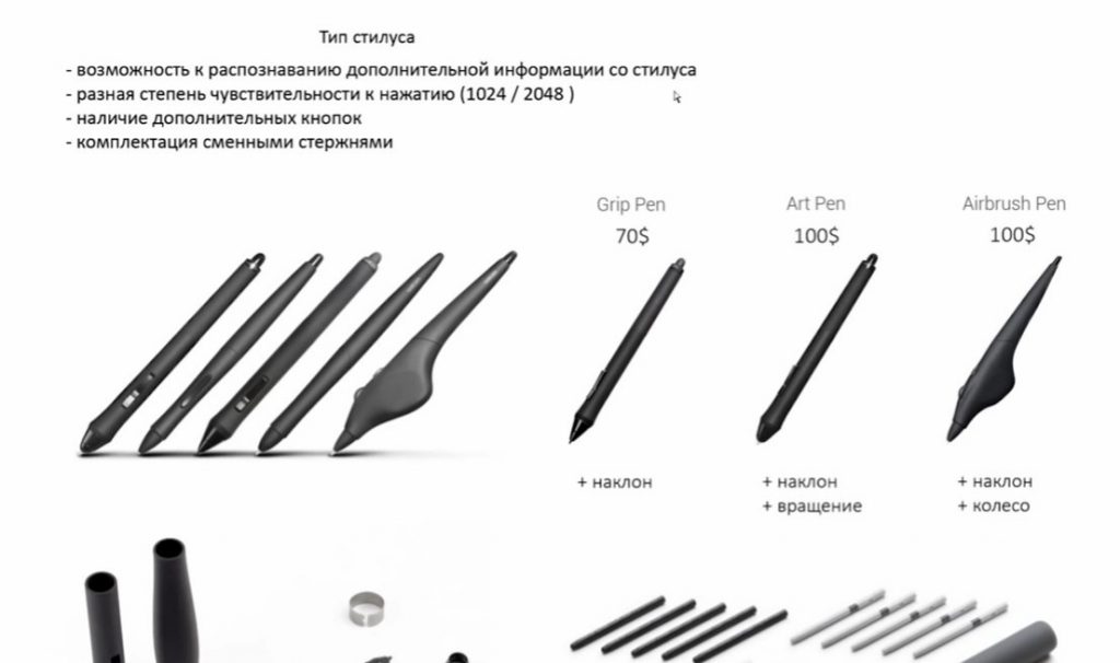 Inclus avec la tablette est un stylo pour le travail, il est appelé "Stylus". Les stylets sont vendus complets avec les appareils, pour le stylet il y a un support dense spécial sur la tablette afin qu'il ne se perde pas. La sensibilité du stylo dépend du modèle; dans les modèles pour professionnels, le stylo a un grand potentiel. L'épaisseur de la ligne dépend du degré de pression sur le stylet, plus la pression est forte, plus la ligne est large.