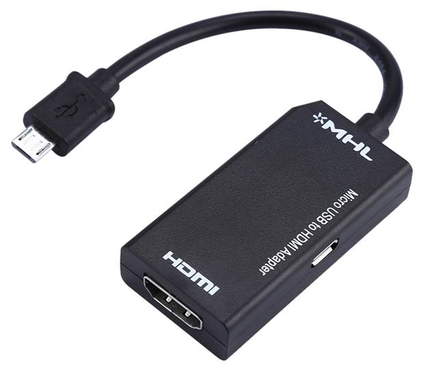 Cette méthode d'appariement n'est idéale que si les deux appareils prennent en charge la technologie MHL. Cette technologie est présente dans les téléviseurs de fabricants bien connus (SAMSUNG, SONY, TOSHIBA, LG), mais les entreprises moins populaires peuvent ne pas être prises en charge.Par conséquent, vous devrez vous assurer que cette fonction est disponible par vous-même, soit sur Internet par le nom de l'équipement, soit par la présence d'une petite inscription sur la prise HDMI.