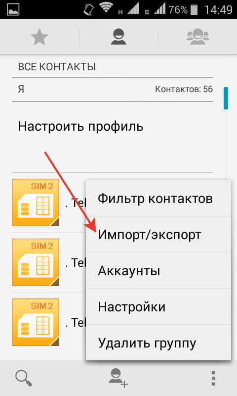 - Ouvrez l'application avec des contacts, dans le coin supérieur des paramètres, accédez à l'option d'importation / exportation.