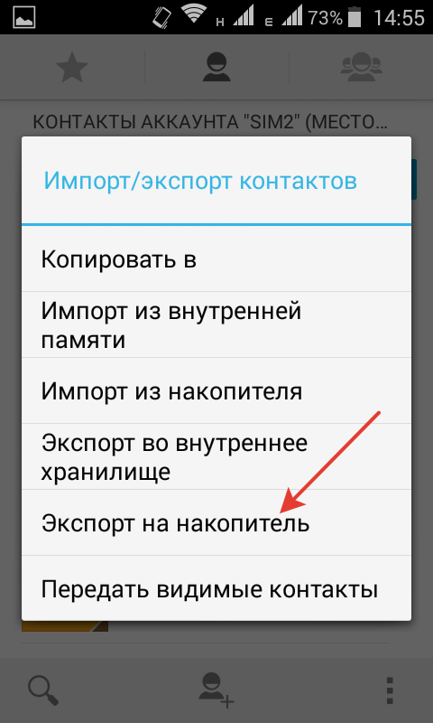 De la même manière, vous pouvez transférer des contacts sur un support amovible - vous devez également sélectionner la position «exporter» et choisir un emplacement pour enregistrer les entrées sur une carte amovible.