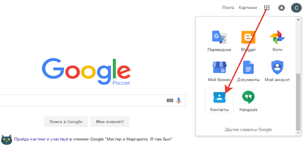 - En haut, cliquez sur la liste de toutes les applications du service (cases), faites-la défiler et trouvez vos contacts.