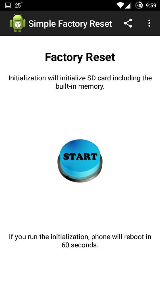 - "Réinitialisation simple du téléphone d'usine." Ce programme peut être téléchargé sur le Play Market. Il lance une restauration automatique des paramètres d'usine. Une fois le programme téléchargé et installé, il est nécessaire de le démarrer et de cliquer sur le bouton «Démarrer» sur l'écran principal. Le principal avantage de ce logiciel est que l'utilitaire peut supprimer des fichiers et des applications individuels.