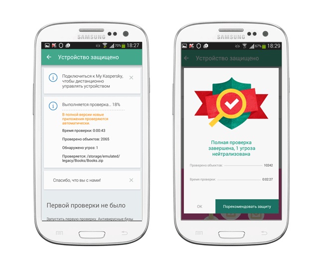 Il n'y a que deux applications à cet effet: Kaspersky Anti-Virus et Security Suite. Ces deux programmes sont très similaires l'un à l'autre. Pour vérifier la présence de virus sur votre appareil mobile, vous devez télécharger l'une de ces applications et exécuter une analyse.