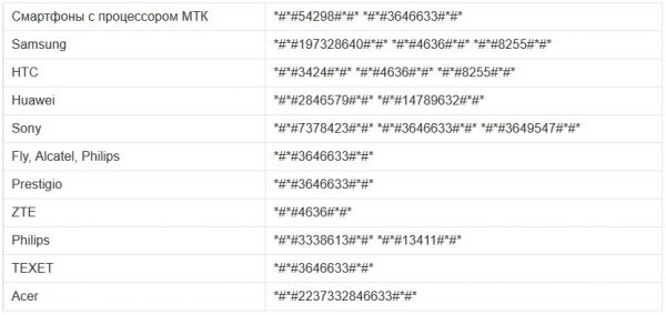 Codes pour entrer dans le menu d'ingénierie dans différents smartphones