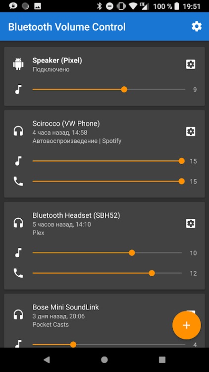 Le nom de l'application révolutionnaire est Bluetooth Volume Control. La grande majorité des smartphones modernes sont basés sur une base de contrôle de 4,2 et plus. Le programme est disponible pour les utilisateurs pour lesquels la version d'Android commence par 4.4. En plus du volume des fichiers audio, vous pouvez régler le niveau sonore des appels des abonnés individuels. BVC contrôle et affiche indépendamment l'heure de la dernière entrée à l'écran.