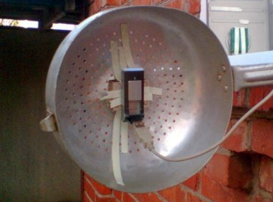 Aucune compétence particulière en ingénierie n'est nécessaire si les anciennes antennes paraboliques sont adaptées pour améliorer la réception du signal. Les passoires ou les casseroles avec poignées conviennent particulièrement. Ensuite, sur la poignée, vous pouvez fixer le câble USB, et le modem lui-même un peu éteint à l'intérieur de la vaisselle comme ceci: