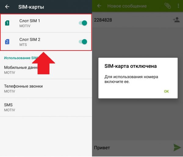 Les moyens de communication bidirectionnels se répandent. Dans de tels appareils, il est généralement possible de désactiver une carte particulière. Essayez de rechercher cette option dans les paramètres du téléphonecependant, si vous ne le trouvez pas, accédez aux messages et envoyez un SMS avec n'importe quel texte à n'importe quel numéro. Si le problème est que la carte SIM est éteinte, votre appareil vous proposera de l'allumer.