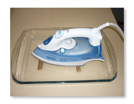 - verser la solution dans un récipient avec un fer à repasser afin que le liquide recouvre la semelle du fer placé sur les bâtons et n'entre en aucun cas en contact avec les parties en plastique du boîtier;