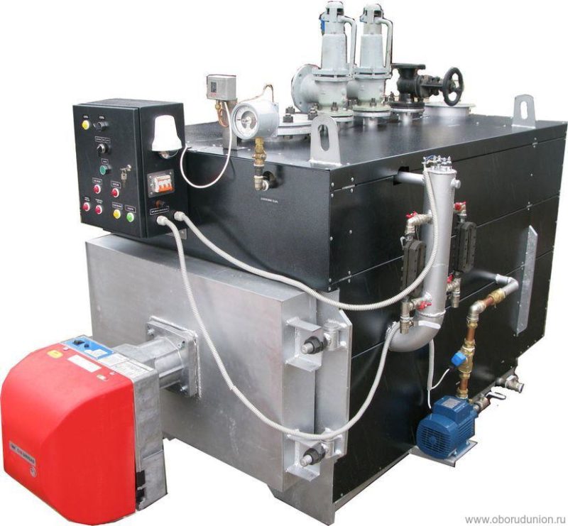 - Générateur de vapeur diesel. Propulsé par le diesel et le mazout. Un tel générateur a une puissance élevée. Son générateur de vapeur est un seul tuyau en spirale continue (bobine). Il dispose d'une chambre de combustion dans laquelle se trouvent les éléments chauffants. Ce type d'équipement est autonome, ce qui lui permet d'être installé dans de petits conteneurs de chaudière.