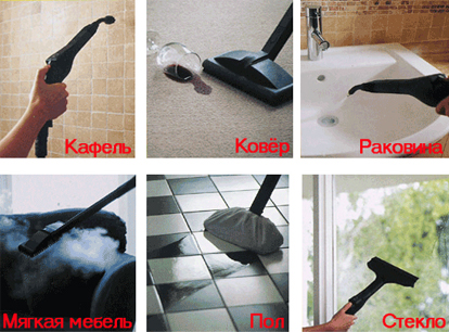 Pour nettoyer les contaminants des surfaces dures, la buse de l'appareil est placée à une petite distance de la surface et le bouton (s'il s'agit d'un appareil portable) ou la gâchette (dans les modèles les plus chers) est pressé, c'est-à-dire qu'il est nécessaire de contrôler le processus d'alimentation en vapeur.