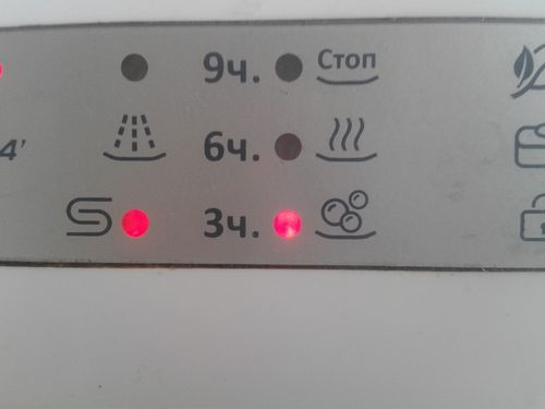 - La LED à côté de l'image du pinceau clignote. La pompe fonctionnera, mais le lave-vaisselle ne commencera pas. Signification: De l'eau a pénétré dans l'égouttement de l'appareil, auquel la machine a répondu en activant automatiquement la fonction Aqua-Stop. Pour ramener l'appareil à sa capacité de travail, il suffit de regarder dans la casserole et d'éliminer l'excès de liquide.