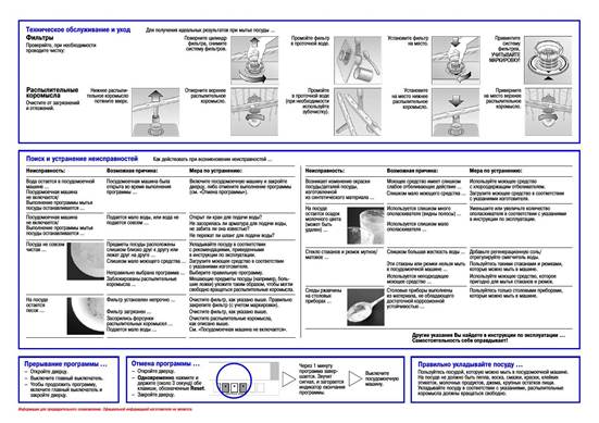 Chaque lave-vaisselle possède un passeport, un manuel d'instructions, qui décrit en détail certains des problèmes qui se posent, ainsi que la façon de les résoudre. Par exemple, lave-vaisselle bosch dans ses instructions, il comporte une section intitulée «Que faire en cas de dysfonctionnement?», qui décrit en détail les messages pouvant être affichés sur le tableau, un tableau détaillé est donné.