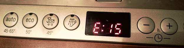 Ce qui importe, c'est le détergent utilisé pour laver la vaisselle. Si le produit contient un coefficient de mousse élevé, de l'eau pendant le fonctionnement peut tomber dans la casserole, à la suite de quoi la machine s'éteindra automatiquement et ne s'allumera pas. Ce mode est appelé «aquastop». À dans la plupart des cas, erreur e15. Dans ce cas, retirez l'eau du puisard. Si vous ne pouvez pas le retirer, vous ne pouvez pas utiliser le lave-vaisselle pendant un certain temps, de sorte que l'eau soit sèche, après quoi la machine peut fonctionner.