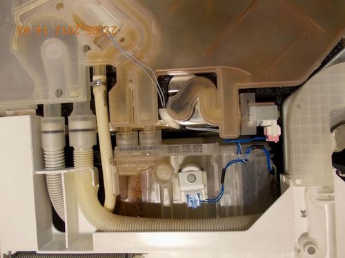 Sur les lave-vaisselle d'autres marques, le remplacement du pulvérisateur est également simple. Concernant le capteur de niveau d'eau, il est situé tout en bas. En cas de fuite, il est tout à fait possible qu'une centaine de capteurs soient en panne. Dans ce cas, aucun signal sur le niveau d'eau ne vient et la pompe ne démarre pas. Il y a beaucoup d'eau - elle coule de la palette directement au sol. Remplacement du capteur requis.