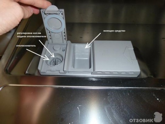 Avec l'équipement, il y a toujours un compartiment spécial pour s'endormir. Pour charger du chlorure de sodium, vous devez dévisser le couvercle et verser le produit dans le réservoir avant de démarrer le programme, afin d'éviter le processus de corrosion. Obligatoire avant de démarrer le lave-vaisselle pour la première fois lisez attentivement les instructions.