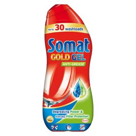 L'un des moyens plutôt simples et efficaces est le produit liquide "Somat", qui se caractérise par un prix raisonnable, mais une efficacité plutôt élevée. Il élimine bien les résidus de poudre et les taches de la surface de la vaisselle, lui donne de la brillance.