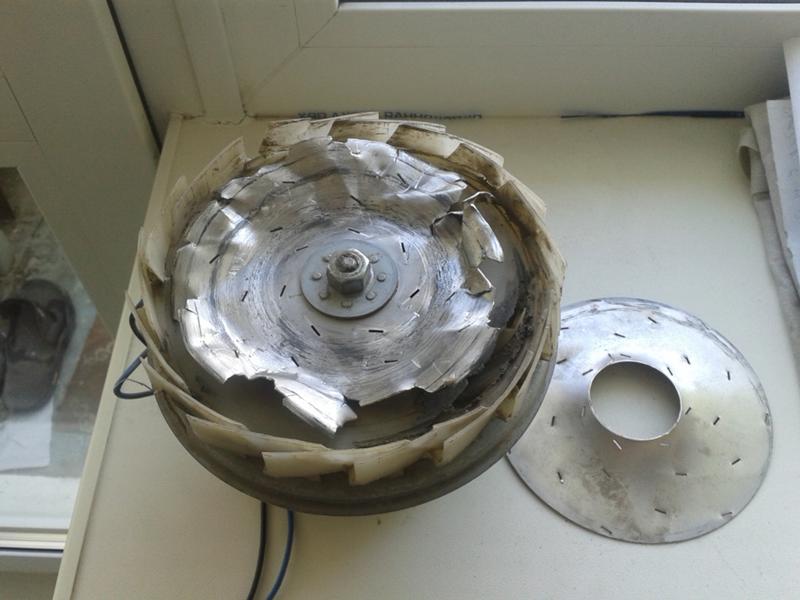 La vieille scie est déformée et transformée en 2 couteaux. Avant de les insérer dans les trous ci-dessus, les couteaux affûtent. Longueur recommandée - 5,5 cm, largeur - 3 cm À l'aide de boulons M6, les pièces découpées sont fixées au disque. Couteaux toutes les 3 tondeuses à gazon.
