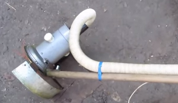 Le moteur est fixé au pied de la barre. Des couteaux de taille similaire à ceux de la section ci-dessus sont montés sur l'arbre. Une autre option consiste à fixer un disque à l'arbre et à y faire un trou pour enfiler la ligne de pêche. Par le haut, pour la protection, l'appareil est recouvert et sécurisé avec un boîtier.