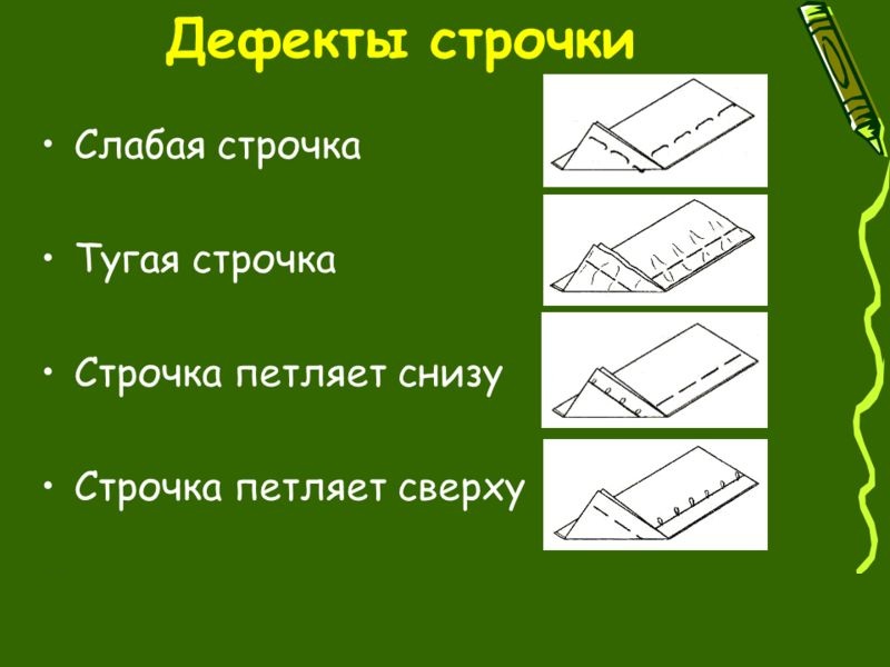 - la manifestation d'irrégularités dans la ligne, à savoir le resserrement du tissu sous la forme d'un accordéon, une traction ou un desserrage excessif de la boucle, ainsi qu'un biseautage de la ligne;