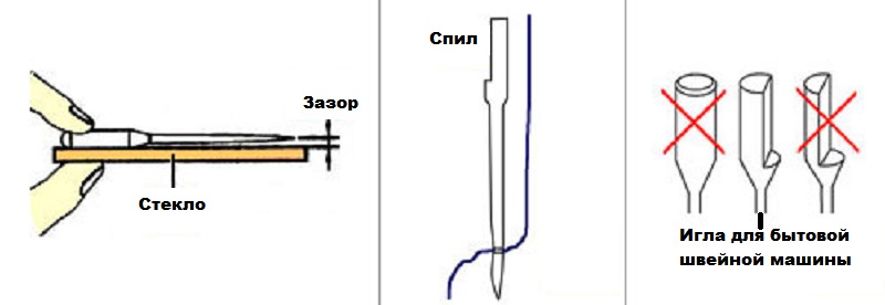 Lors du remplacement d'une aiguille à coudre, il est nécessaire de choisir cet élément correspondant strictement au type de machine. Vous ne devez en aucun cas installer une aiguille conçue pour une machine à coudre industrielle. Il est extrêmement difficile de les confondre, car les aiguilles pour appareils industriels n'ont pas de scie sur le flacon. En utilisant une telle aiguille dans une machine à coudre domestique, l'écart entre la lame d'aiguille et le nez du crochet est violé, ce qui dans le meilleur des cas conduit à des points sautés. Et au pire - pour endommager la navette de la machine à coudre. Il est également très important que l'élément soit correctement positionné dans le porte-aiguille, ce qui consiste à trouver la lame par le côté du nez du crochet.