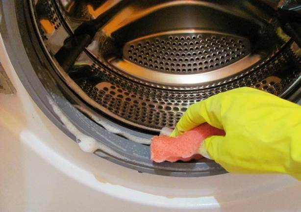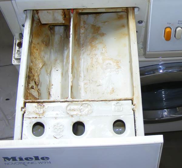 - Manque de soin pour les éléments de l'appareil. Une machine à laver, comme un autre appareil, doit être lavée et nettoyée. Si l'hôtesse néglige de prendre soin du bac à détergent, il y a un foyer de moisissure. Dans les cas où une couche de poudre sèche est observée sur les parois de la cuve ou s'il y a des résidus de liquide de rinçage, ils doivent être retirés. Une fois par mois, il est recommandé de laver complètement l'article et de l'essuyer.