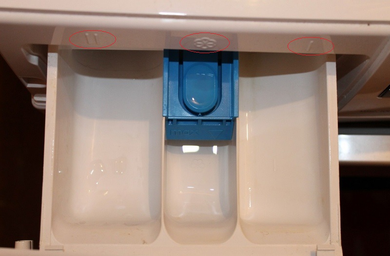 - Le plateau est divisé en 3 compartiments - les 2 premiers sont utilisés pour la poudre et le troisième pour la climatisation. Selon le mode de lavage, il est nécessaire de déterminer le compartiment à poudre (il y a une répartition détaillée sur la face avant du bac).Par exemple, lors d'un lavage à une température de 90 degrés, la poudre est versée dans le premier compartiment.