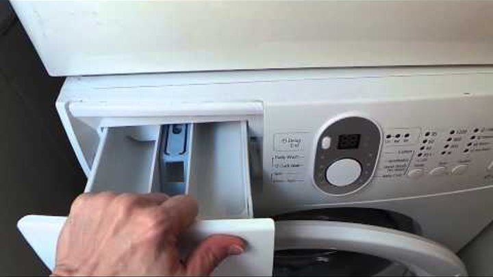 - Tout d'abord, vous devez trouver le plateau de chargement. Le plus souvent, il est situé dans le compartiment supérieur droit ou gauche de la machine à laver.