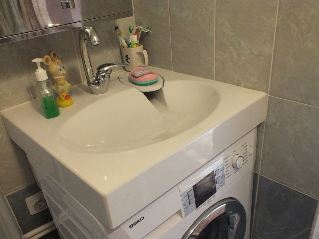 Photo: baignoire à Khrouchtchev avec une machine à laver installée. Il s'agit d'une option de placement compact sous l'évier. Économisez de l'espace sur votre visage.