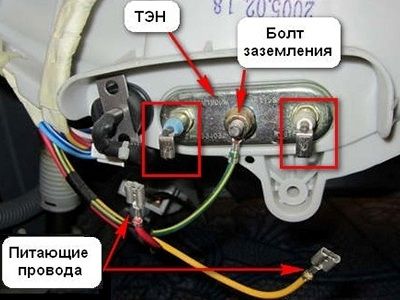 Très soigneusement, lentement, insérez le chauffage de la machine à laver, il doit bien s'asseoir sur le siège. Après cela, serrez les attaches, connectez les fils et serrez le boîtier SMA.