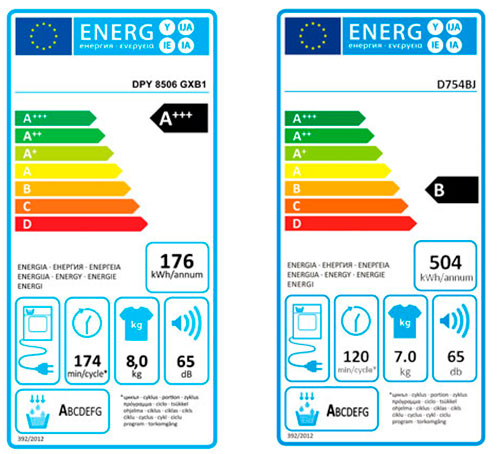 Les sèche-linge sont divisés en classes à moindre coût en termes de consommation électrique et à forte consommation d'électricité.