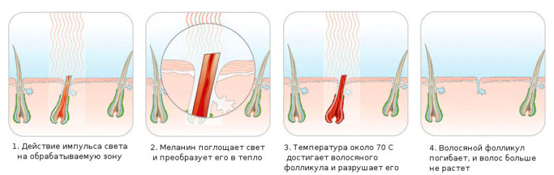 L'exposition aux rayons lumineux provoque un échauffement et une destruction supplémentaire des follicules, un processus appelé photothermolyse. L'énergie lumineuse n'affecte que les follicules au stade de croissance active, jusqu'à 80% de tous les follicules disponibles.