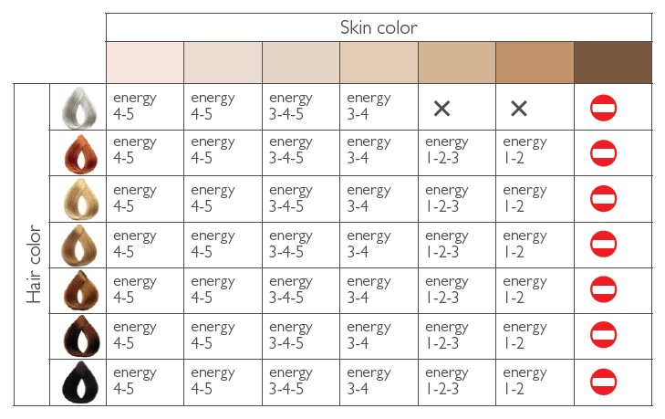 Les instructions pour les photoépilateurs ont généralement une échelle de couleurs qui vous permet de déterminer le type de couleur de la peau et des cheveux et d'ajuster le mode de fonctionnement approprié. Dans les modèles plus chers, il existe un système de détection automatisé, et l'appareil se réglera automatiquement, il suffit de l'apporter à votre peau et vos cheveux.