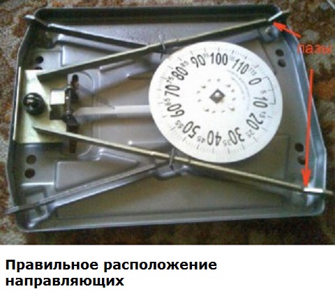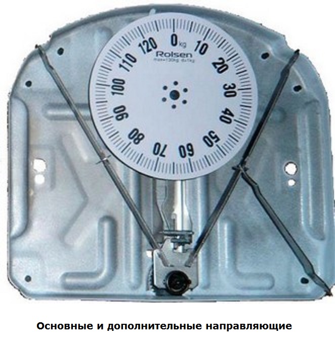 Vous devez d'abord vérifier l'emplacement correct des quatre guides, vérifier combien leurs rainures s'insèrent correctement dans les évidements correspondants situés aux coins du boîtier. Ce n'est qu'après cela que vous devez les incliner et inspecter la connexion avec le ressort principal. Une cause courante de la panne des balances mécaniques au sol est le glissement de deux rails supplémentaires reliés aux principaux. Ces dommages se produisent en raison d'un choc ou d'une chute. Il suffit de mettre les guides en place, et l'appareil fonctionnera.