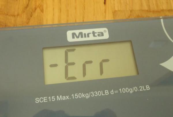 Une telle inscription n'est absolument pas un motif de réparation. Le message d'erreur indique uniquement un dysfonctionnement mineur pendant la pesée. Dans ce cas, placez la balance sur le sol et ne vous tenez pas dessus jusqu'à ce que l'inscription disparaisse. Lorsqu'ils affichent à nouveau trois zéros et que cela prend quelques minutes, vous pouvez continuer à utiliser.