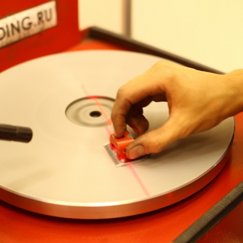 Après l'application de graisse et de poudre abrasive, l'affûtage des couteaux démarre. Pour ce faire, installez un pointeur laser magnétique. Fixez la lame avec un support magnétique. Allumez la machine et mettez-vous au travail.