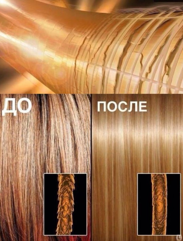 Lors du lissage des cheveux à la kératine, après avoir soigneusement nettoyé les mèches avec du shampooing, elles sont recouvertes d'une composition spéciale, dont les principaux composants sont la kératine elle-même et divers types de silicones. Ils saturent la structure de chaque cheveu et l'enveloppent d'un film protecteur, ce qui assure leur protection et restauration supplémentaires. De plus, le film qui, après la procédure, recouvre chaque noyau, les rend plus épais, ce qui signifie que le volume des boucles augmente considérablement.
