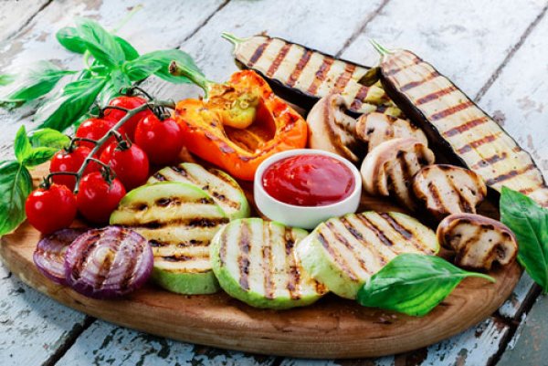 Les légumes cuits sur un gril électrique de contact ont des rayures rouges caractéristiques