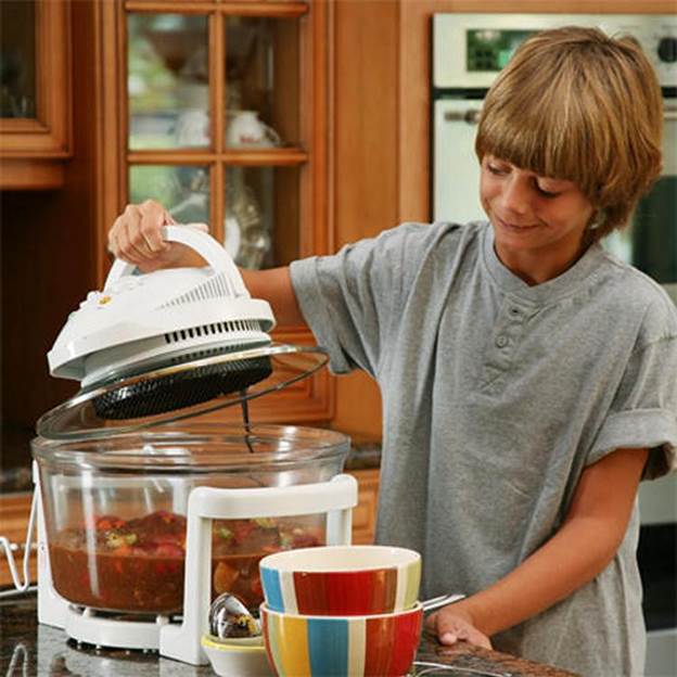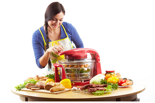Dans les appareils avec un radiateur halogène, pour que les aliments atteignent l'état de préparation nécessaire, des courants d'air chaud sont utilisés, qui soufflent des produits de tous les côtés. Un tel processus conduit à un chauffage uniforme du plat, de plus, toutes les substances utiles sont conservées dans les aliments.