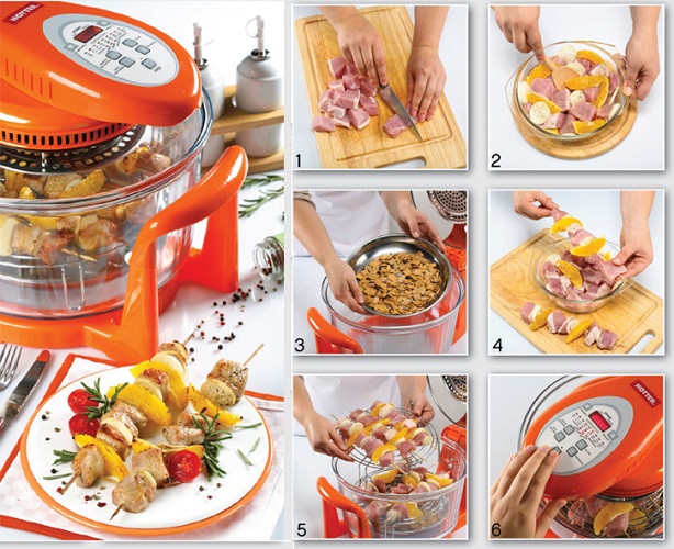 L'appareil cuit à l'aide de courants d'air chaud, qui circulent librement dans un récipient spécial pour la cuisson. Pendant la cuisson, l'utilisateur n'a pas besoin de retourner constamment les aliments. De plus, la cuisson ne nécessite pas d'huile, tandis que la nourriture est juteuse et aromatique, les plats sont trempés dans leur propre jus et deviennent tendres et très mous.