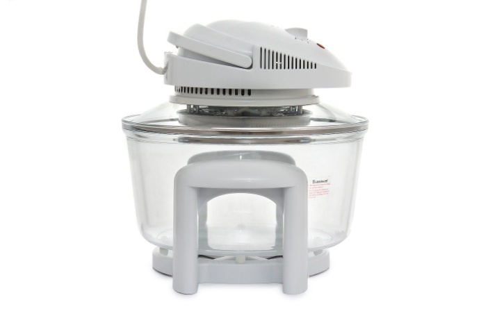 Le gril à air se compose d'une casserole (ou d'un bol) et d'un couvercle en verre réfractaire. Parfois, il existe des modèles en plastique réfractaire. En volume, il peut varier de huit à 16 litres, et en paramètres - de l'ordre de 30 à 60 centimètres.
