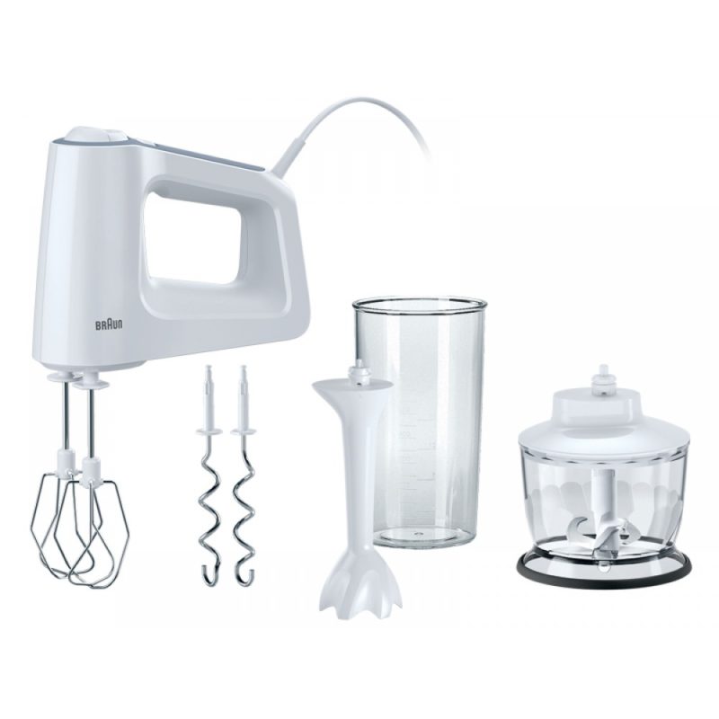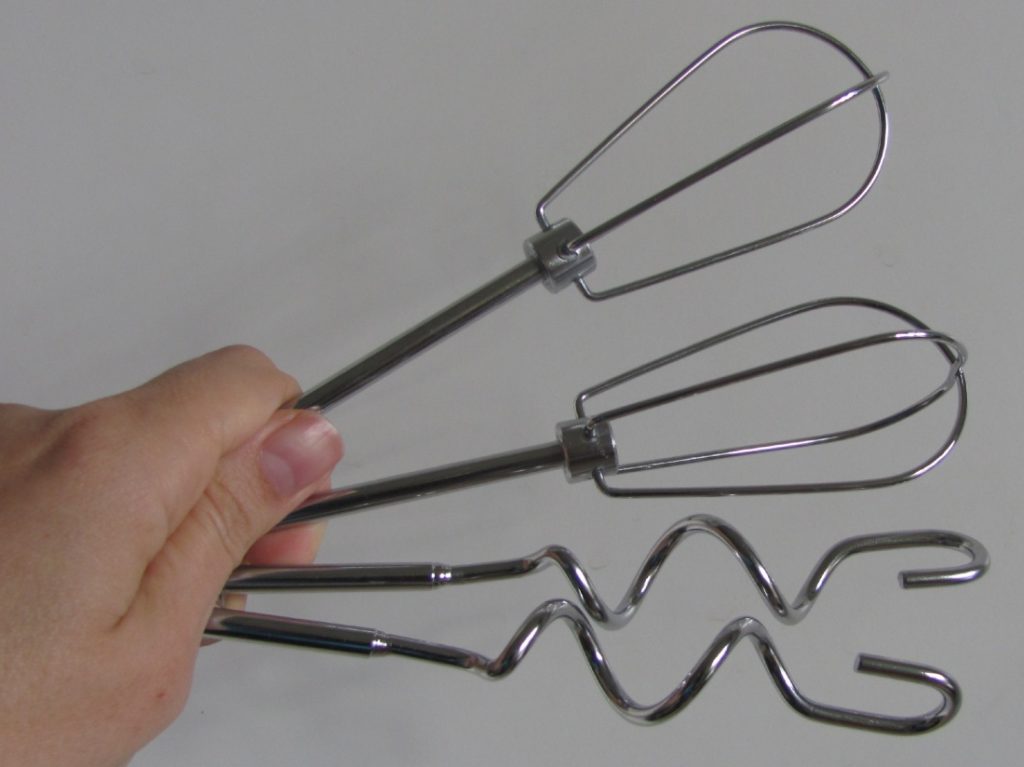 L'objectif principal du mélangeur est de mélanger et de fouetter les produits. Pour cela, une paire de batteurs en métal solide et résistant à l'usure est utilisée comme outil de travail principal dans cet appareil. Avec l'aide d'eux, vous pouvez transformer simplement et rapidement les blancs d'oeufs ou la crème épaisse en mousse aérée. Pour mélanger des mélanges plus denses, deux éléments en spirale avec un crochet par le bas sont utilisés comme buses. En les utilisant, vous pouvez pétrir la pâte qualitativement, sans craindre que le moteur ne supporte pas une telle charge. Dans le même temps, il est impossible de moudre des produits solides tels que le sucre, le café, les noix ou la glace avec un fouet ou une buse en spirale avec un crochet.
