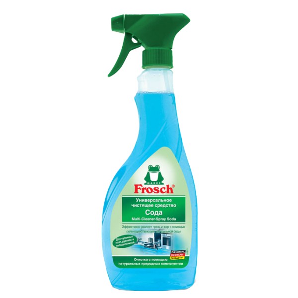 • Frosh est un détergent écologique avec de la soude comme composant principal. Le produit est un liquide bleu versé dans un récipient avec un spray. Appliqué et distribué en surface, il mousse un peu, tandis que de petites particules de soude sont ressenties au toucher. Son utilisation consiste à appliquer sur la surface puis à l'essuyer après un court instant;