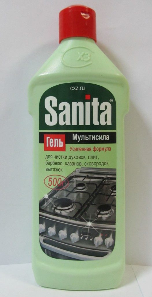 • Sanita - gel nettoyant pour nettoyer le gel. Pour l'application, vous pouvez utiliser n'importe quel appareil improvisé, mais en même temps, tout le travail doit être effectué uniquement avec des gants. Le temps d'exposition pour la décomposition des graisses est de 20 minutes. En raison du ramollissement des contaminants gras au cours du processus d'exposition, ils descendent progressivement le long des murs. Après une exposition pendant la durée spécifiée, la surface du four doit être soigneusement lavée.