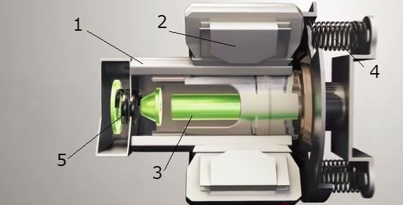 Un cylindre est un logement dans lequel se déplace un noyau, qui est une tige de piston. Il est fait, comme le noyau, principalement en acier inoxydable. La bobine du solénoïde est en cuivre, sert à induire l'EMF et à mettre le noyau en mouvement. Le ressort de tige le ramène à sa position d'origine, tandis que les ressorts de compensation amortissent les vibrations des mouvements de va-et-vient du noyau (tige). Le matériau des ressorts est en acier.