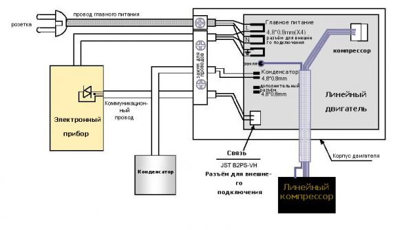 Contrairement aux conceptions antérieures, lorsque des compresseurs à piston avec un mécanisme de manivelle entraîné par un moteur électrique étaient utilisés, les unités linéaires modernes se débarrassaient du moteur électrique et du vilebrequin, et en même temps le nombre de points de friction diminuait, ce qui les rendait nettement plus silencieux (de 15 à 15). 20 dB), et le rendement est plus élevé. Le rôle du dispositif d'entraînement a reçu un solénoïde, dont le noyau est relié au piston. Lorsqu'elle circule à travers une bobine AC, la tige déplace le piston dans une certaine direction, comprimant ainsi le réfrigérant. Ensuite, le ressort situé à l'extrémité de la tige la ramène à sa position d'origine et le processus se répète. Ainsi, le mouvement alternatif du piston crée une pression dans la ligne de refroidissement.